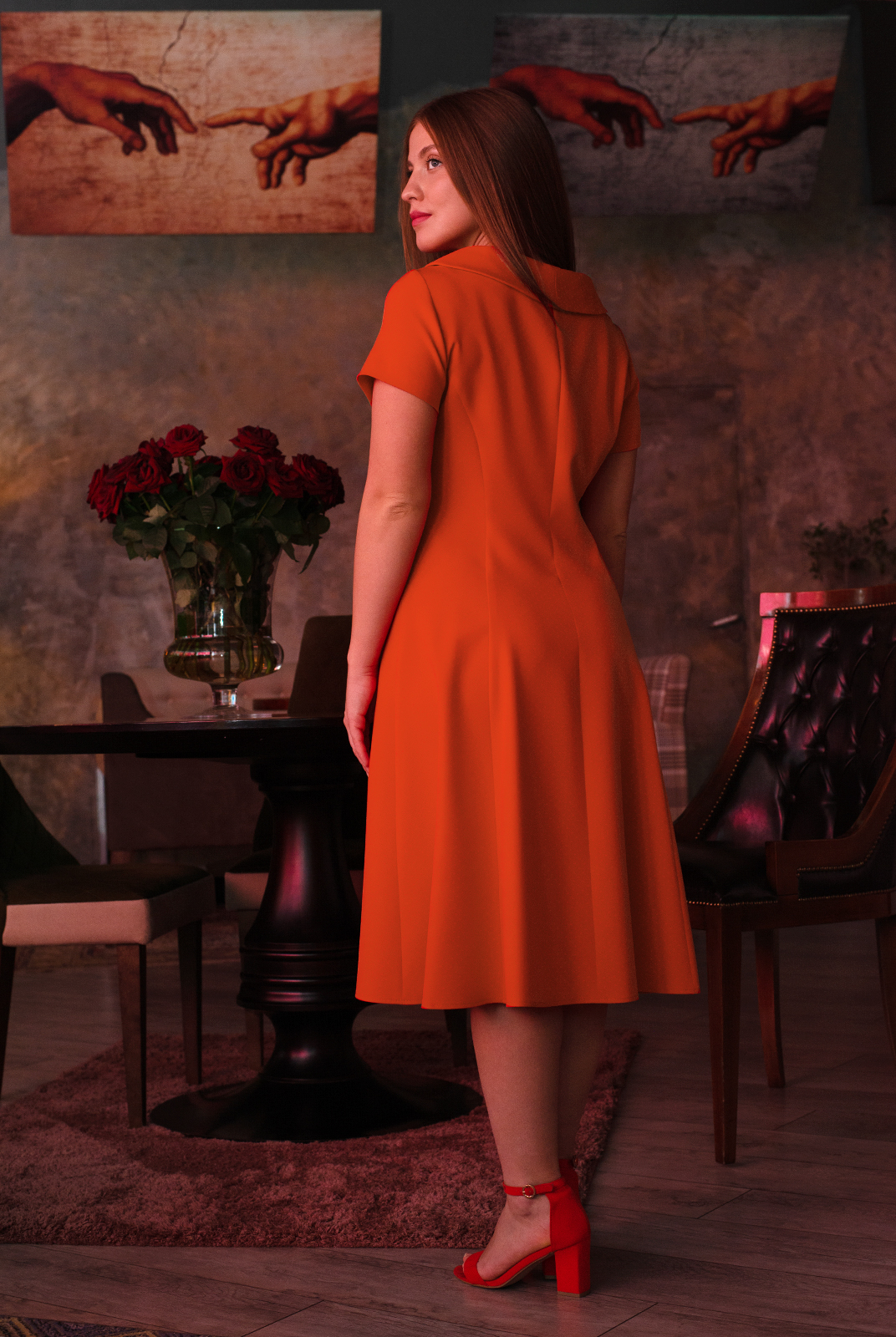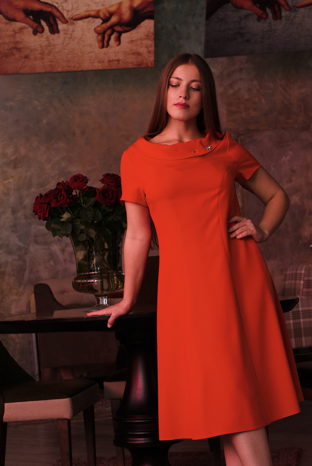 Платье приталенное , к низу расширенное.Мягкий струящийся силуэт подчеркивает все достоинства фигуры.