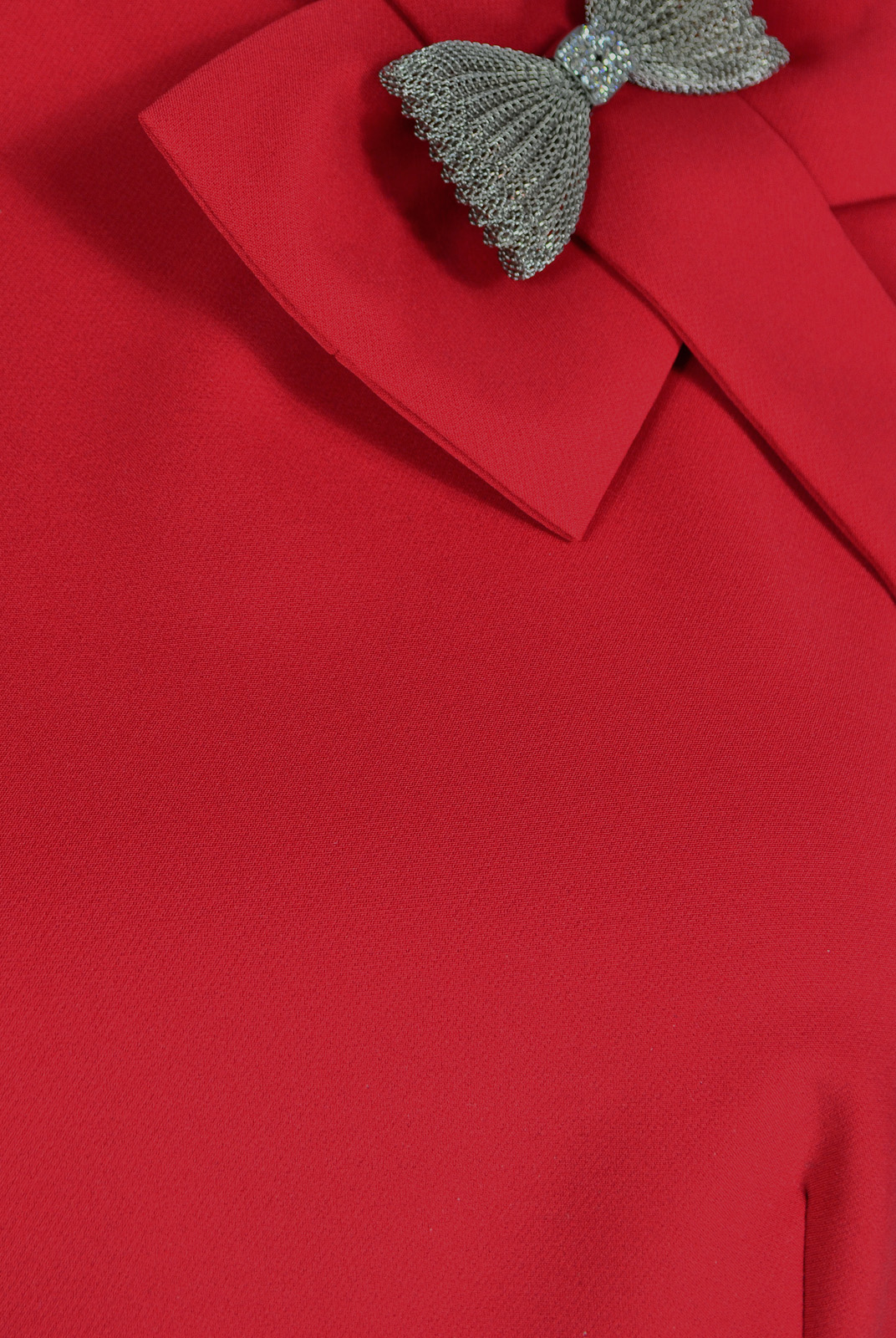 В левый рельеф переда вставлена декоративная деталь с бантом. В верхней части оката рукава складки и сборка.