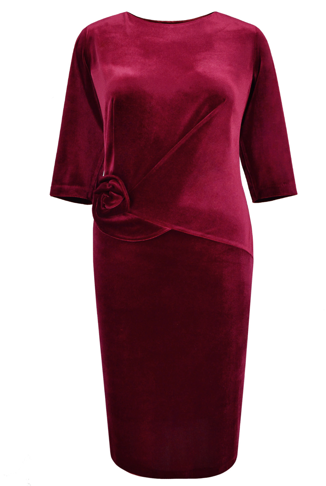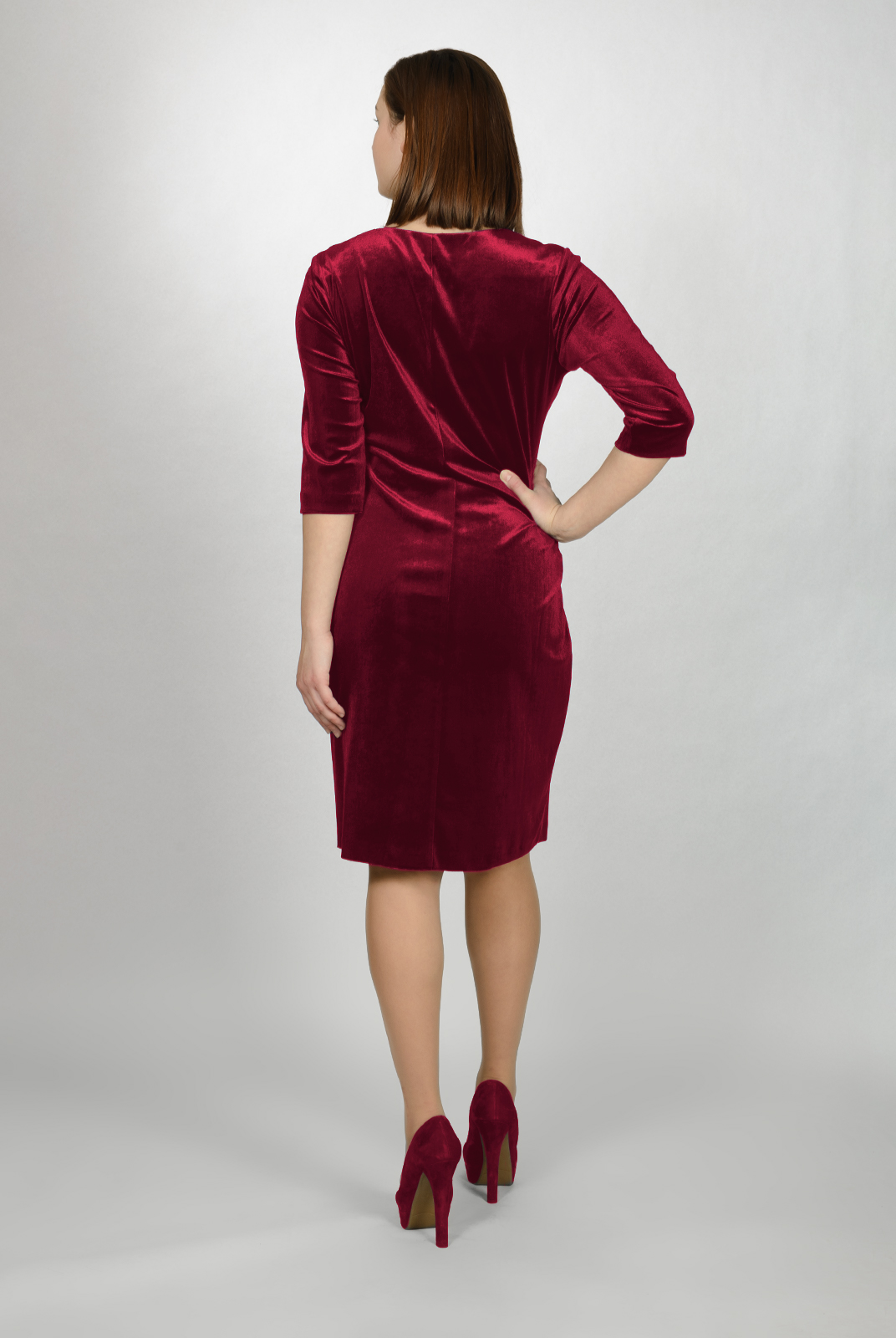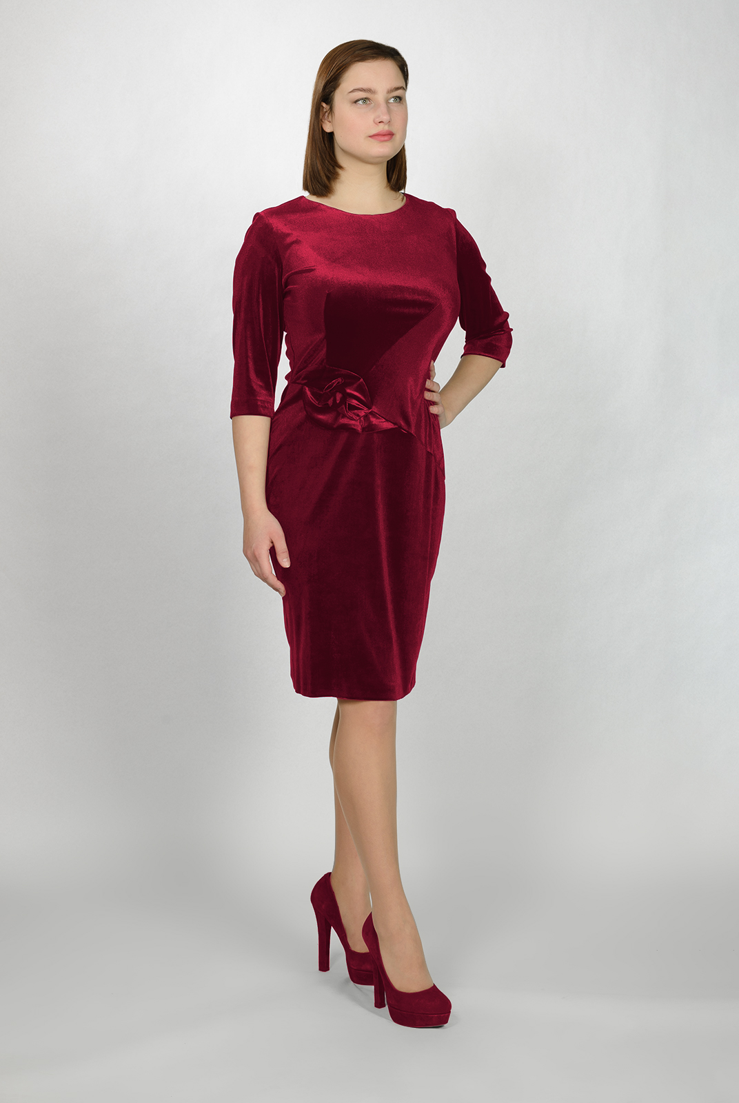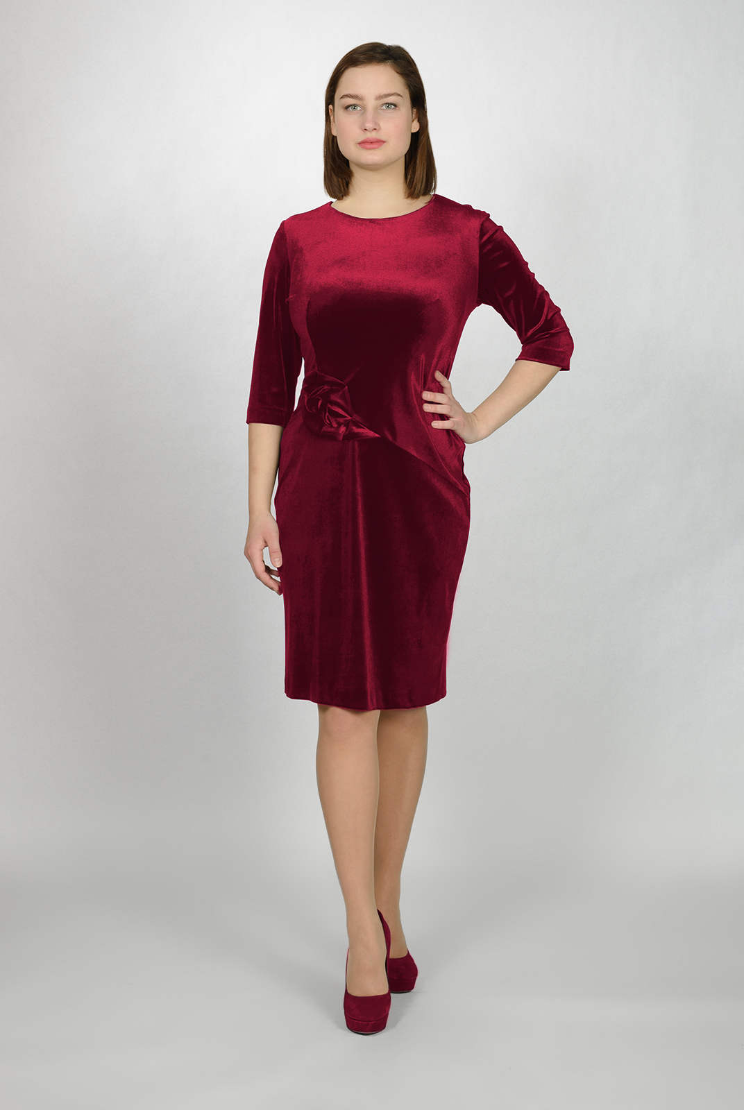 Нарядное платье из бархата. Хорошо подчеркивает фигуру, а декоративный элемент придает изделию изюминку. Отличное решение для торжественного мероприятия.