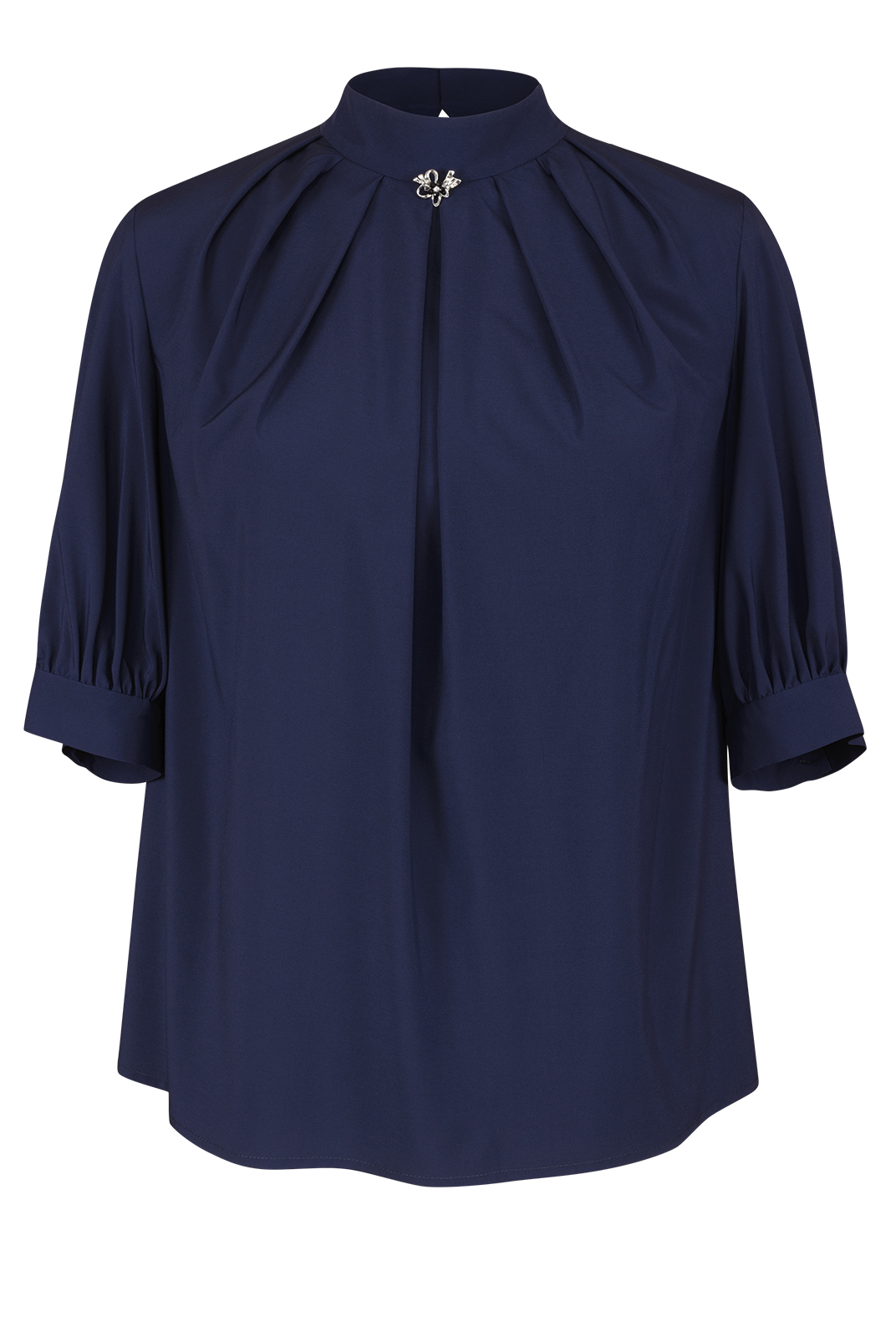Блузка с воротником-стойкой, оформленная складками и декоративной брошью, сделает Ваш образ женственным и элегантным.