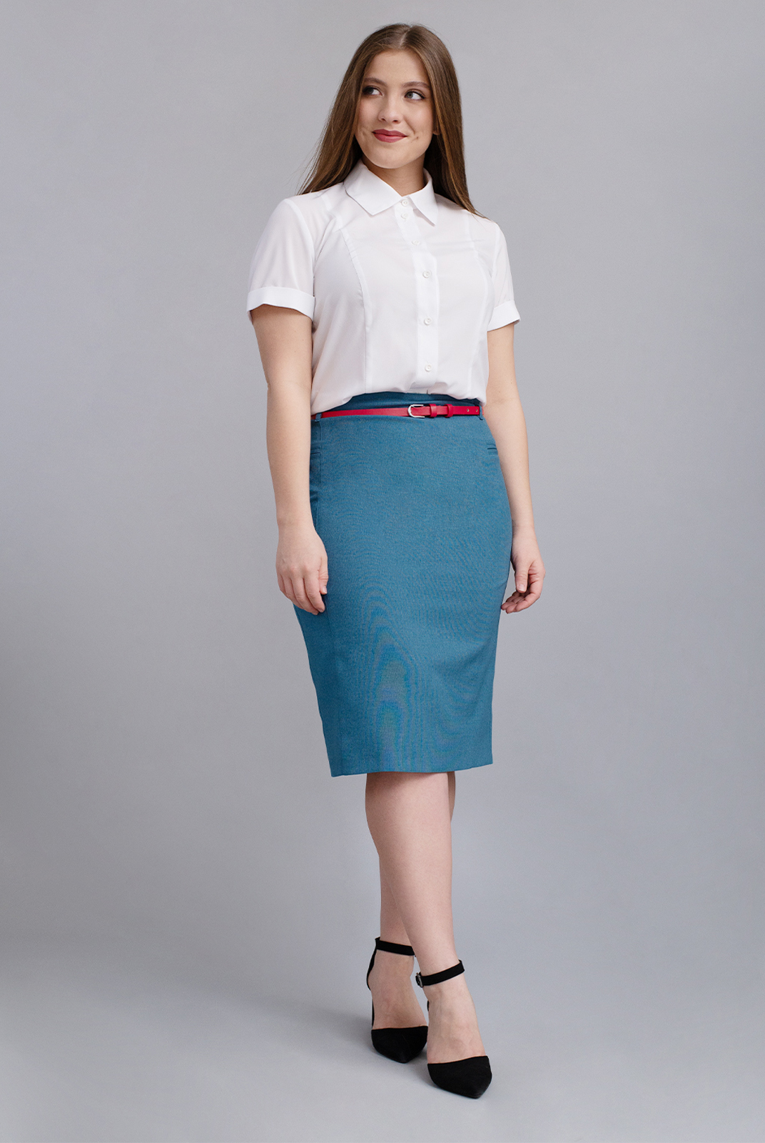 Юбка заужена книзу , что прекрасно стройнит фигуру любой женщины.