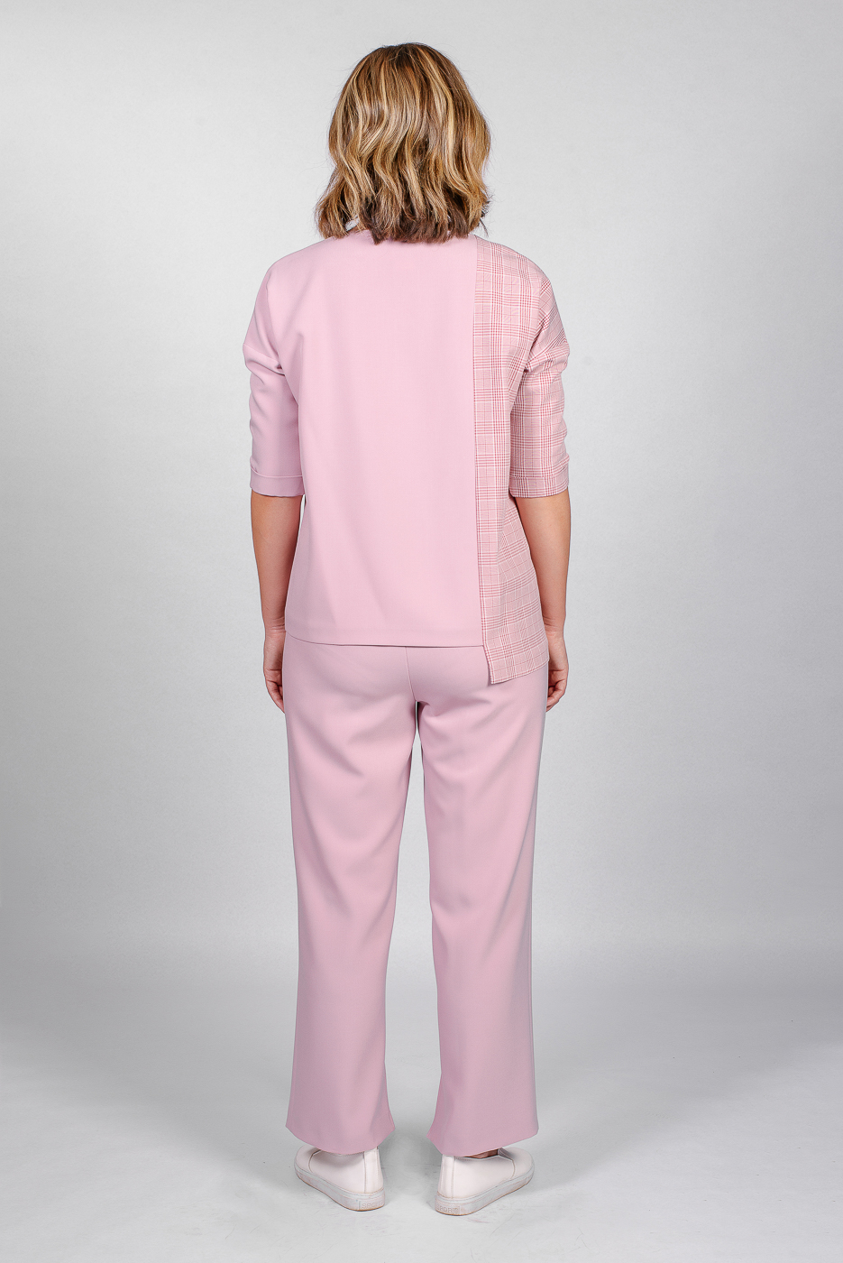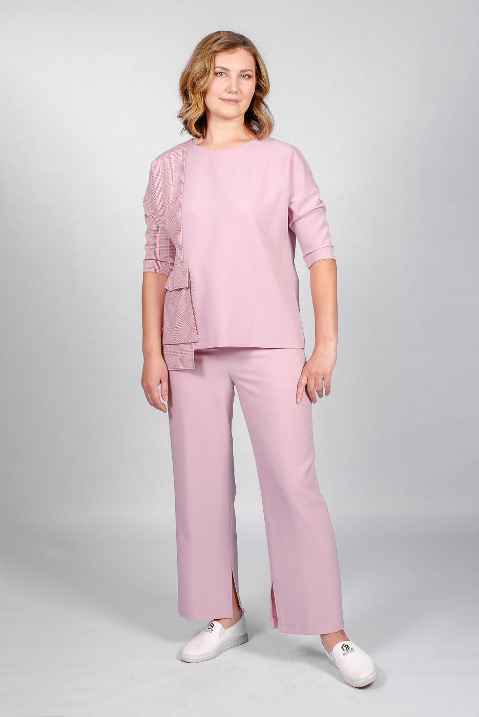 Интересный клетчатый принт и яркие акценты делают образ динамичным. Прекрасное решение для эффектного появления в офисе.