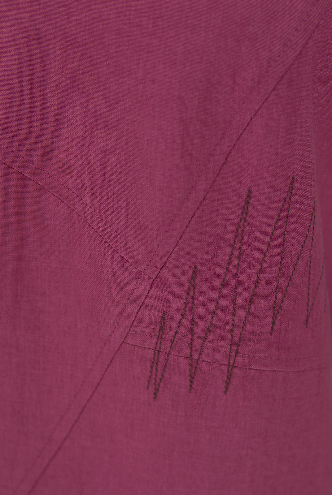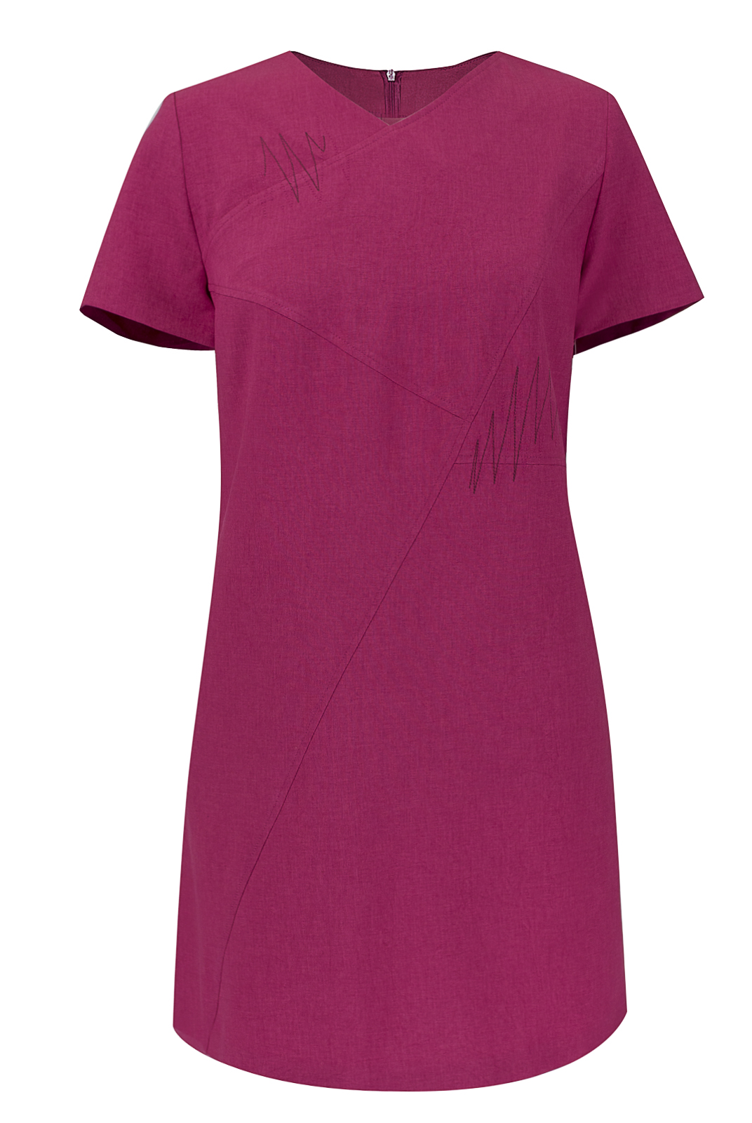 Ассиметричное конструктивное решение передней половинки платья подчеркнуто зигзагообразной декоративной строчкой,что придает модели динамичность и наделяет ее выразительностью.