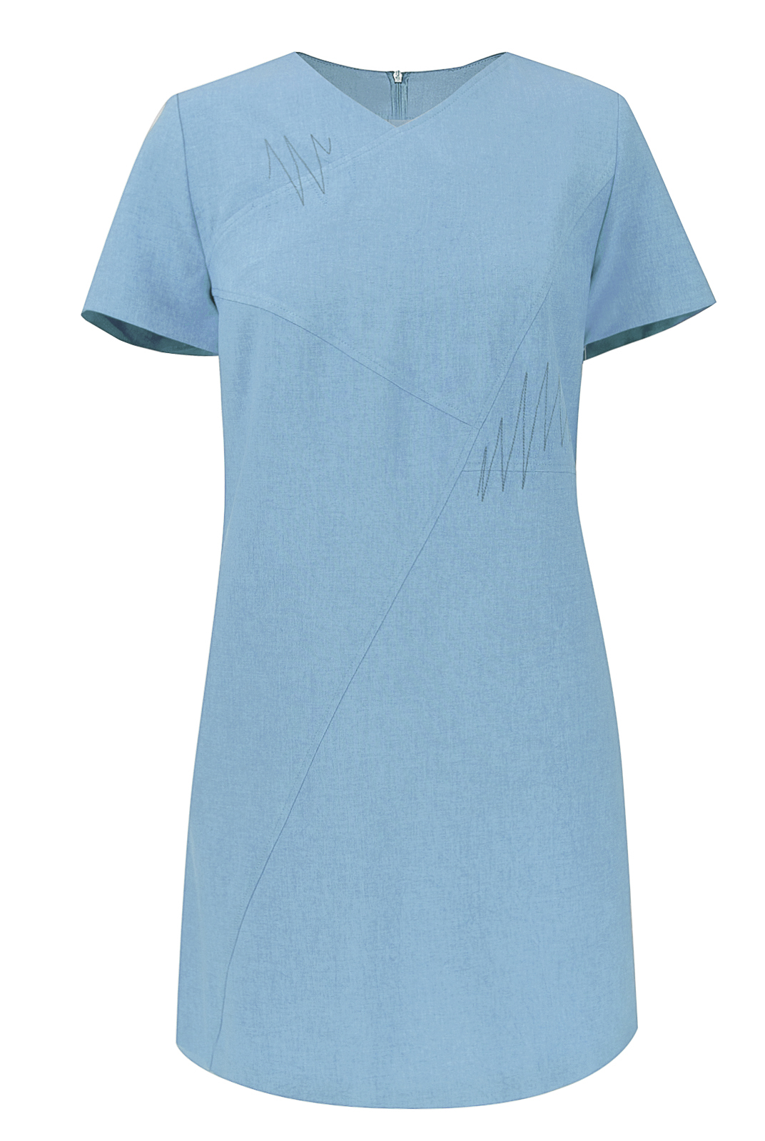 Ассиметричное конструктивное решение передней половинки платья подчеркнуто зигзагообразной декоративной строчкой, что придает модели динамичность и наделяет ее выразительностью.