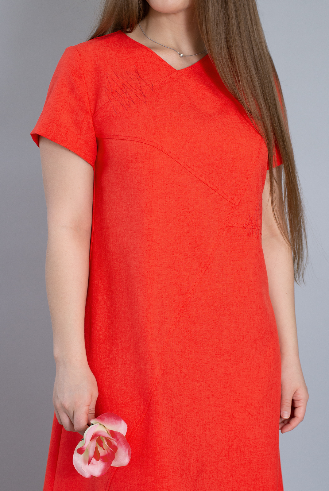 Ассиметричное конструктивное решение передней половинки платья подчеркнуто зигзагообразной декоративной строчкой, что придает модели динамичность и наделяет ее выразительностью.