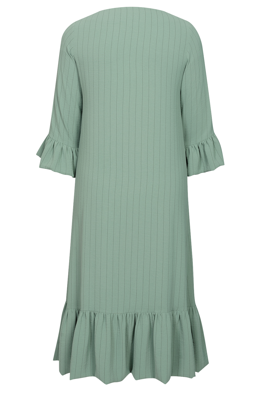 Платье А-силуэта сдержанного оттенка спаржи идеальный вариант для тех, кто ценит приглушенные цвета. Тонкая полоска на ткани задает визуальные вертикали, гармонизируя пропорции фигуры. Широкая оборка по низу изделия придает модели динамичный акцент.