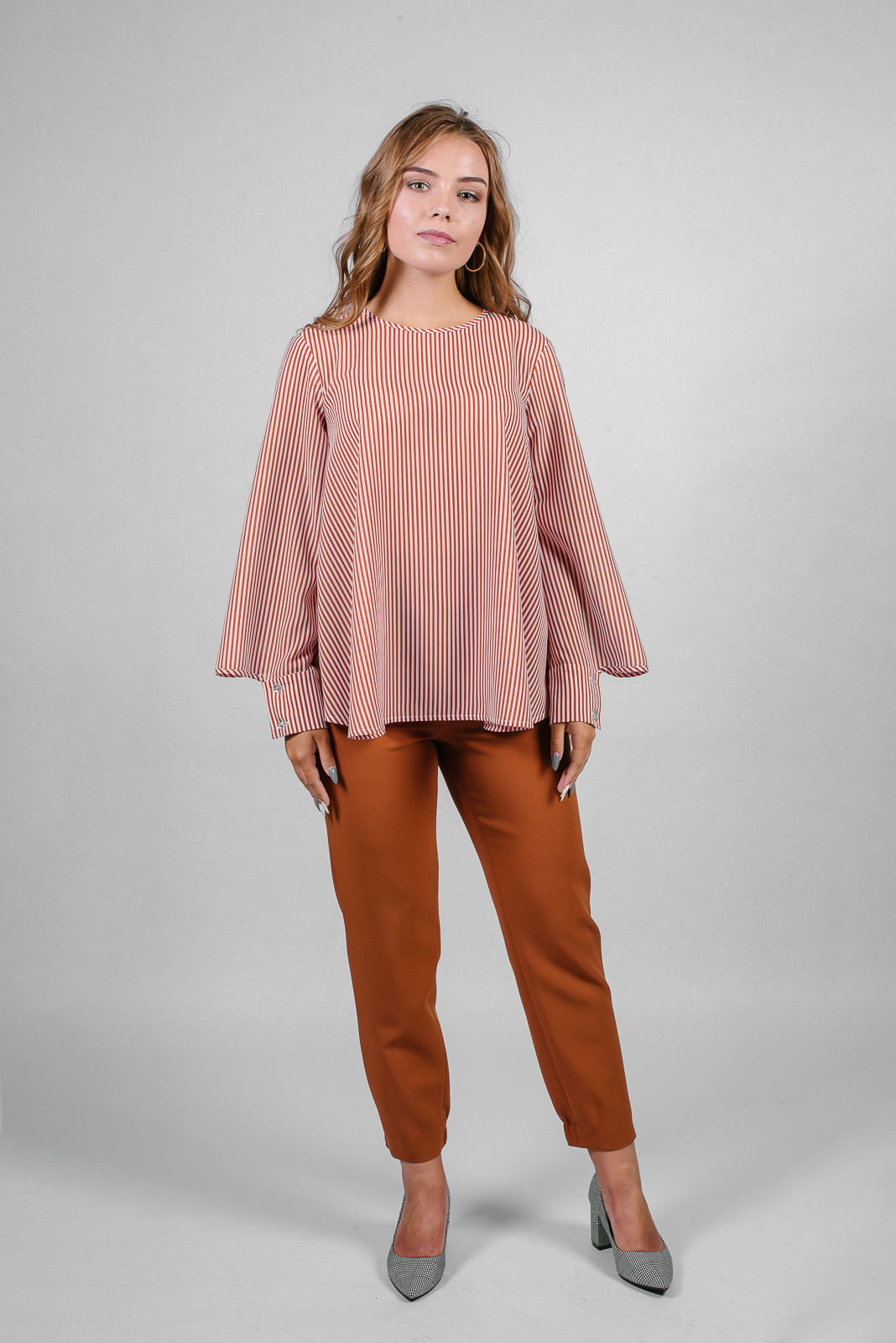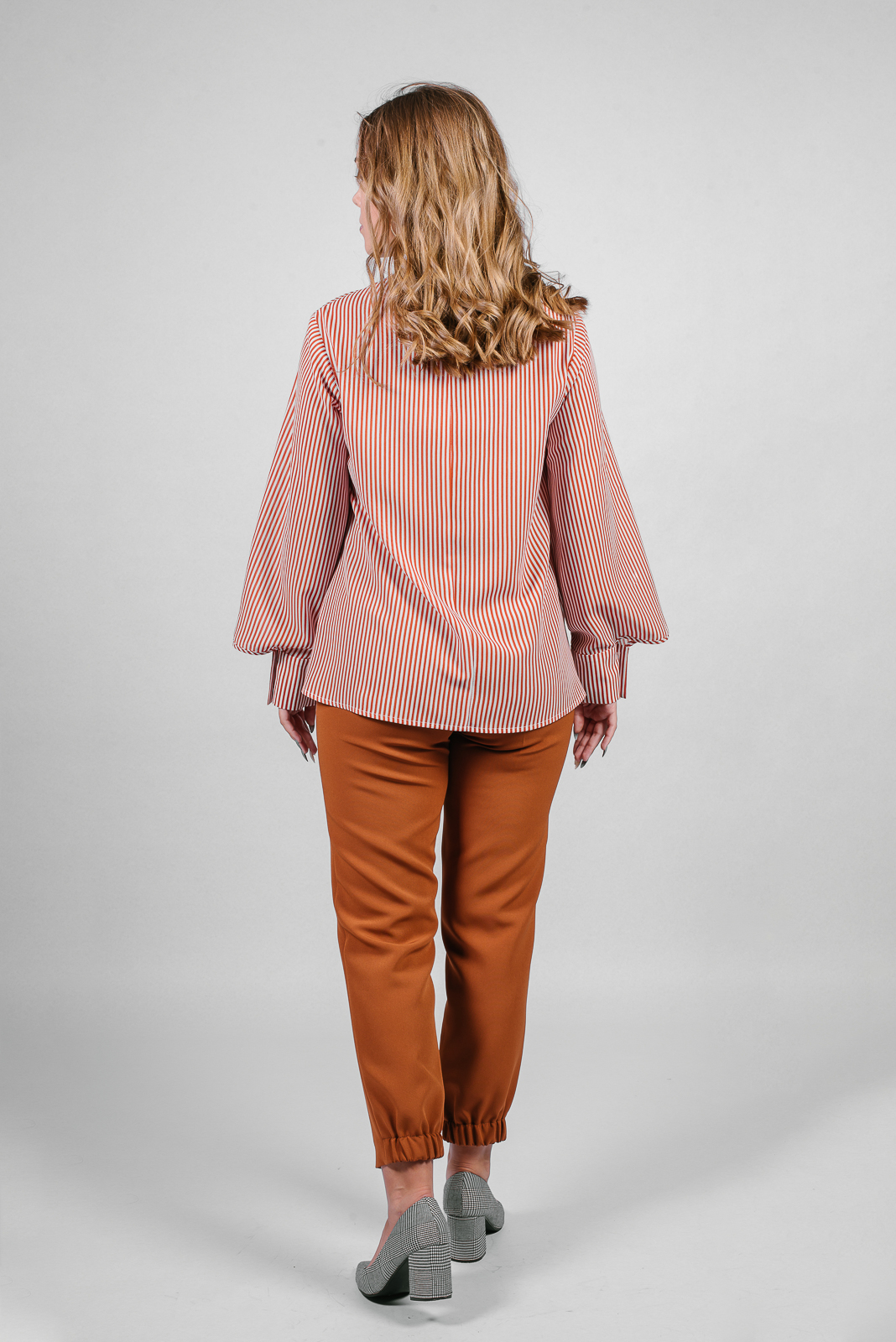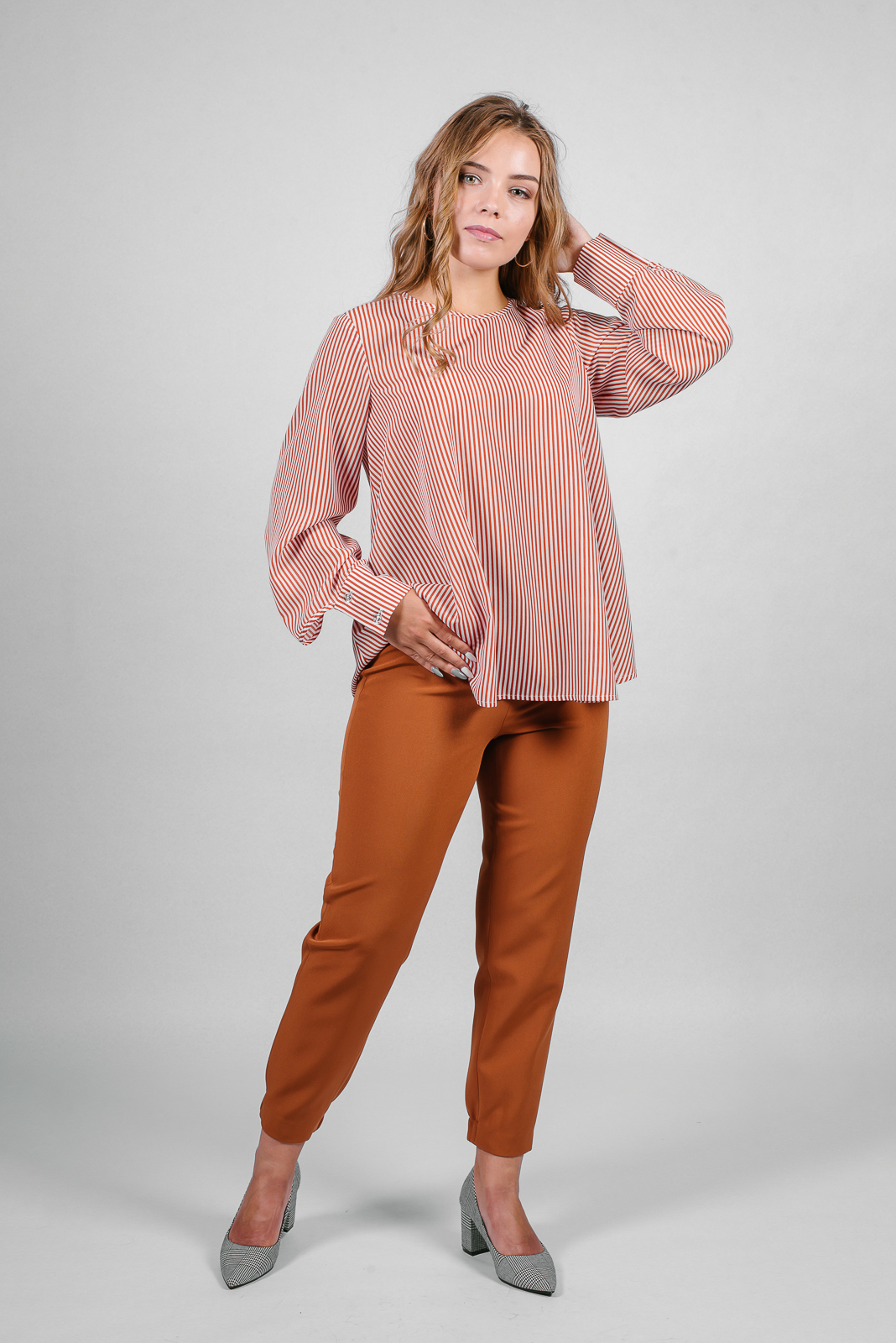 Брюки умеренного обьема из костюмной ткани. Модель, зауженная книзу и частично собранная на эластичную тесьму.