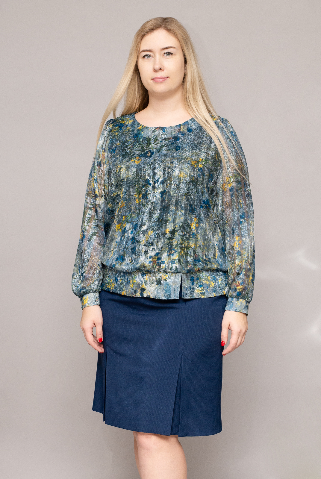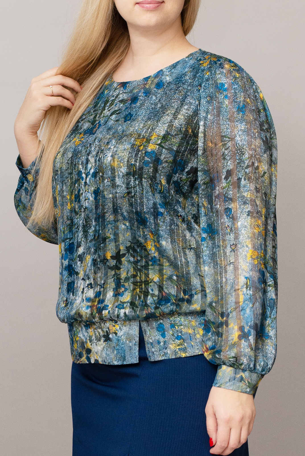 Блузка с мелким цветочным принтом будет смотреться строго и торжественно в формате офиса. За счет широко пояса по низу изделия модель хорошо фиксируется на бедрах. Небольшой асимметричный разрез спереди обеспечивает люфт при посадке. Модель будет смотреться наиболее торжественно с классическими брюками или юбкой черного, тесно-синего оттенков.