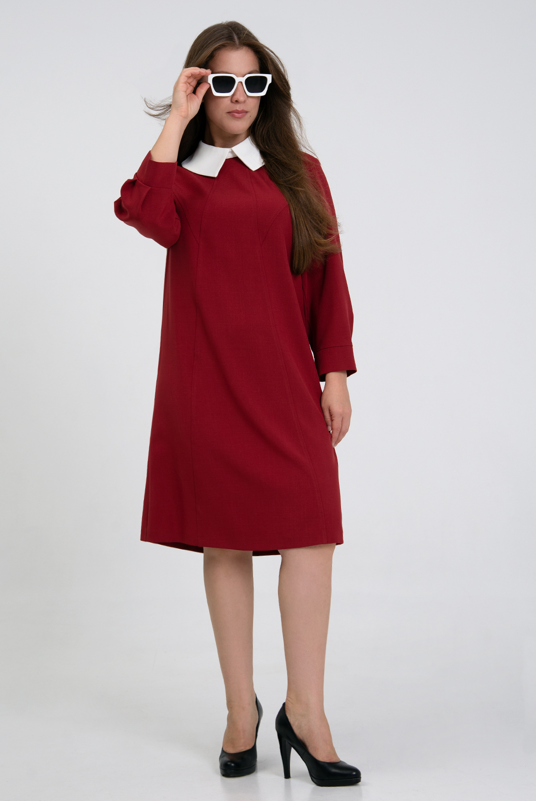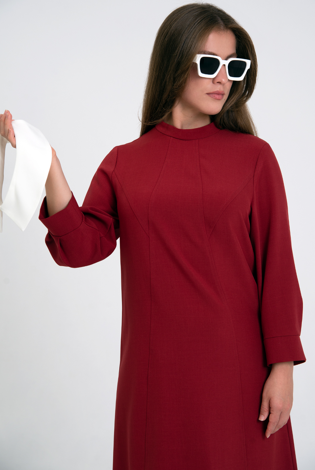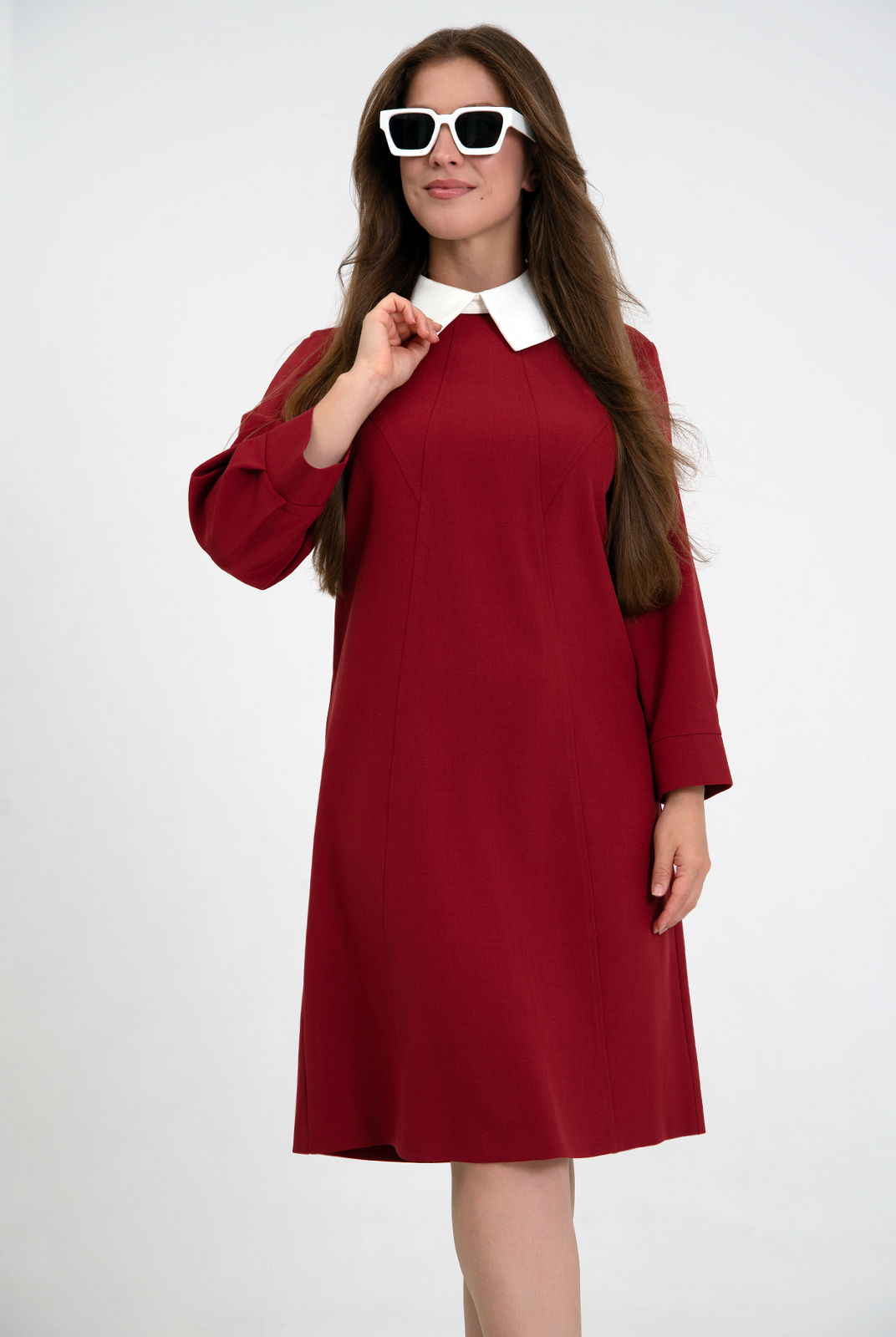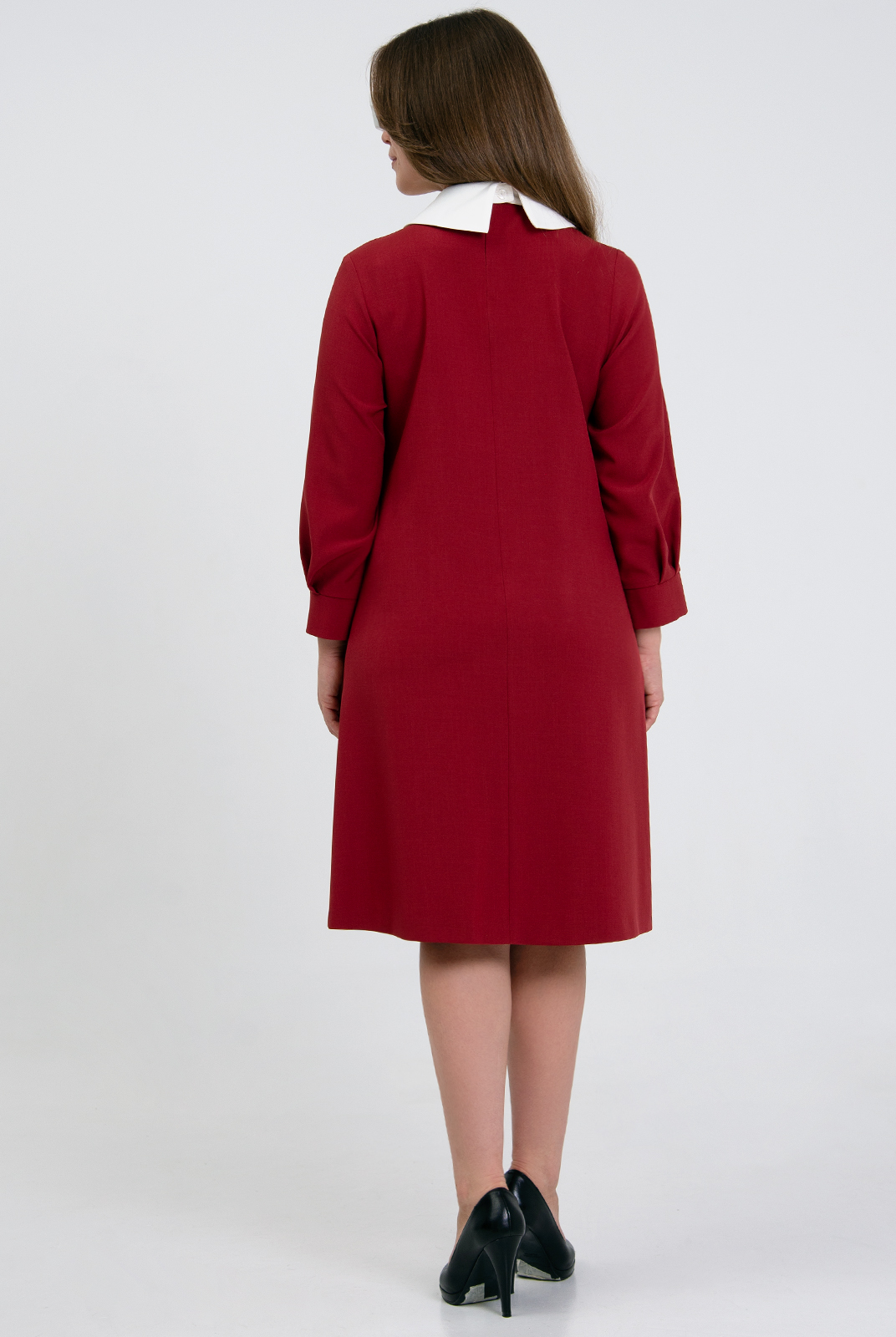 Съемный воротник из отделочной ткани на отрезной стойке с острыми концами закрепляется на пуговицу.