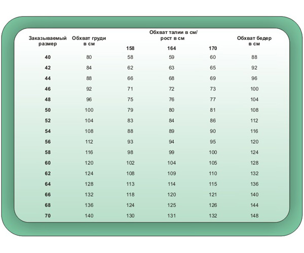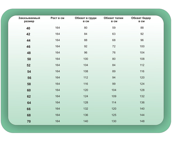 После снятия мерок Вы сможете легко определить свой размер с помощью таблицы: